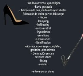 Citas kinky Acompañamiento Fantasia novia kinky Algunas de las prácticas kinky y de bdsm que realizo: Dominación erotica Masajes , prostatico , - Spanking, en cuerpo , pies con varilla Cinto , regla , mano , y otros elementos Bastinado - Facesitting - Pegging / straponn -cambio de roles - Ballbusting - Tortura genital - Tortura de pezones - SPH - Petplay - Waxplay, -juegos con hielo - Edging - Humillación verbal psicológica Fisica - Lluvia plateada - Adoración de pies, medias de nylon y botas - Adoración de varias partes del cuerpo Dominación erotica -Foot job . Lucha - Findom - Trampling - ballbusting - sonda uretral - inyecciones - servilismo - Feminizacion - Momificacion - Adoracion de cuerpo completo , genitales ,pies calzado - fetiches varios - fisting - enemas - adiestramiento Maquillaje y transformismo -Atencion a parejas para adiestramiento -entre muchas otras mas Dominación bdsm ; fantasías varias; practicas diversas de distinto nivel de intensidad , para experimetados y principiantes , , No llamadas solo mjes WhatsApp / telegram mismo número. Reserva de sesión con Seña y anticipación; Venta de contenido personalizado . Todos los morbos viven en un solo lugar Mi infierno ;Mistress excelente nivel ; profesionalismo, discreción, me encuentro entre Córdoba capital ,centri , el respeto es la base de mi forma de vida , si no la tuya por favor no me contactes .. ,Atiendo personas de todos los generos y discapacidades físicas, distintos niveles ; adiestramiento; querés conocer el fuego de mi infierno y crees merecerlo te espero para que lo demuestres