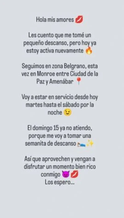 Hola corazón 😘 Soy Liz nuevamente! Vuelvo otra vez, pero solo por unos meses... 💫 Brindo servicio convencional y completo, con un adicional 🔥. Todo es con preservativo, sin excepción. 🕐 Horarios: Todos los días de 12 a 22 hs. 💰 La tarifa corresponde a 1 hora de servicio convencional, con hasta 2 participaciones. 🎈El condón corre por mi cuenta, marca prime. No realizó servicio de menos horas. 📍Zona Belgrano. 📸 Antes del encuentro, solicito una foto del rostro para saber con quién me voy a encontrar, sin excepción. (La foto se puede enviar configurada para que se vea solo una vez 👀) Para info detallada del servicio, mandame WhatsApp 📲