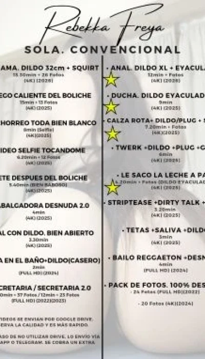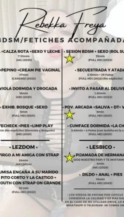 Hola. Soy REBEKKA FREYA, la reina de tus fantasías 😈 ✨ Ofrezco servicios de: ☆ VIDEOLLAMADAS ☆ SEXTING (chat hot con fotos y videos DEL MOMENTO) ☆ LLAMADA DE VOZ (sexo telefónico) ☆ DICK/CUM/ASS RATE (audio o video) ☆ FEMDOM & BDSM ☆ FETICHES, ROLE PLAY, FANTASÍAS Y MORBOS ( SIN LIMITES ‼️ no digo que no a ninguna fantasía) ☆ CATÁLOGO DE VIDEOS (convencional y BDSM/fetichista) ☆ CONTENIDO PERSONALIZADO (podes jugar a ser el guionista de tu propio video) 🚫NO HAGO ENCUENTROS/REALES/CITAS🚫 💋 Te animás a probarme? Te espero caliente, con muchas ganas y SIN LÍMITES 🔥 😏