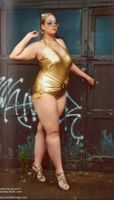 Sexy kurvige Figur, charmantes Lächeln, schöne leuchtende Augen.